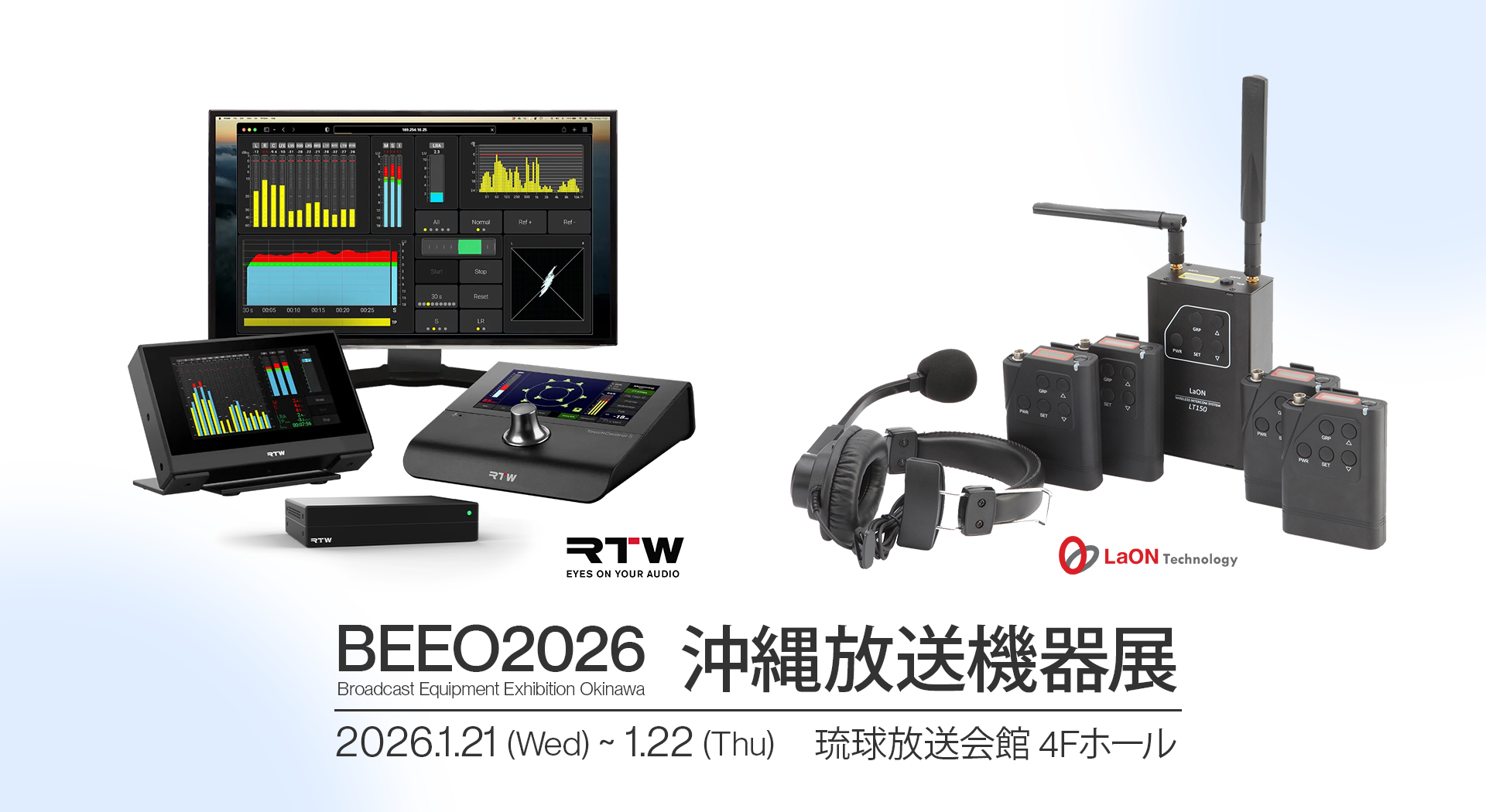 RTWのメータリング機能付きモニターコントローラー「TouchControl 5」をはじめ、LaON Technologyのインカムシステム、Cornererd AudioやBlaze by Sonanceの設備向けスピーカーなどを展示予定です。