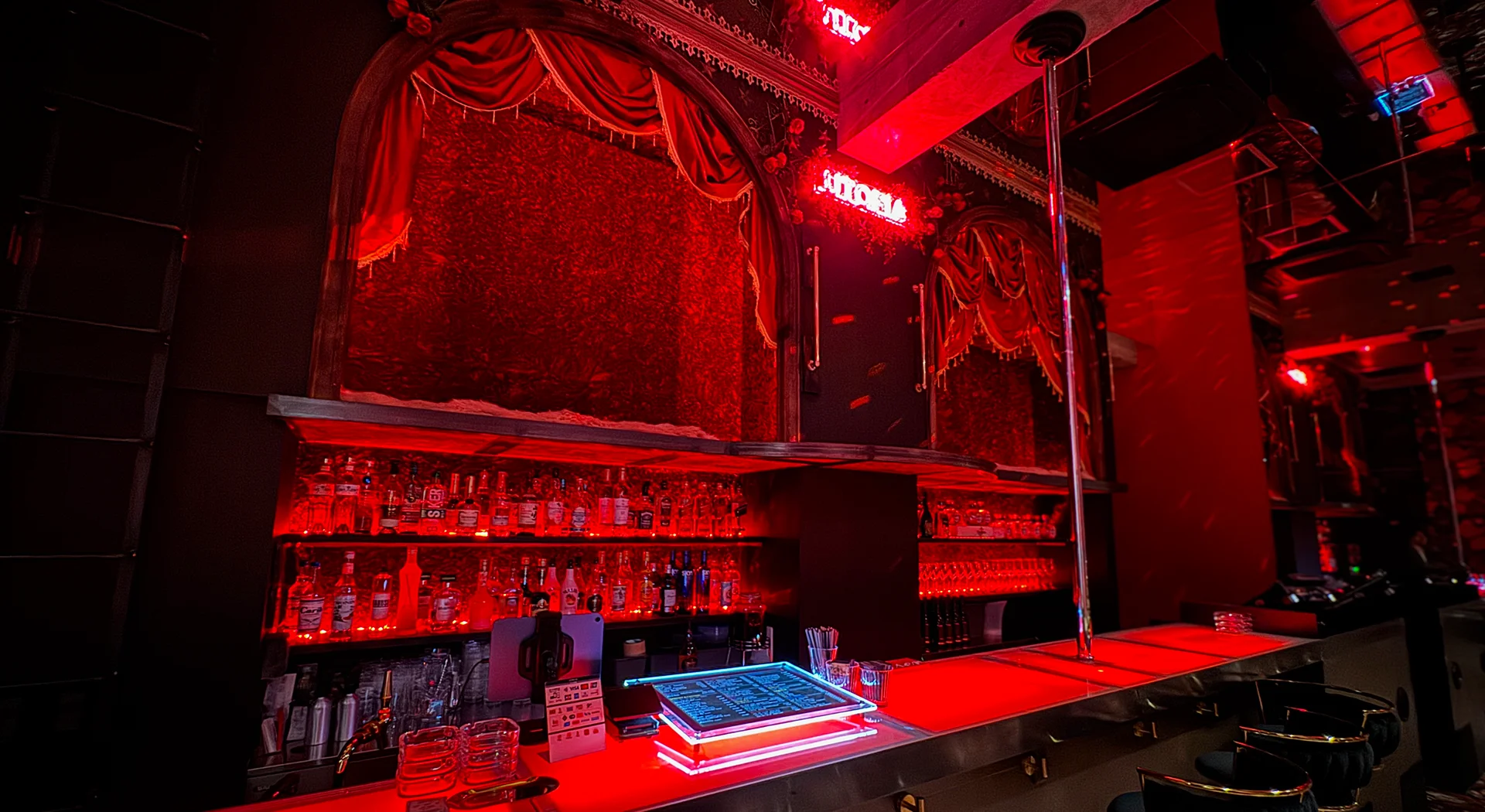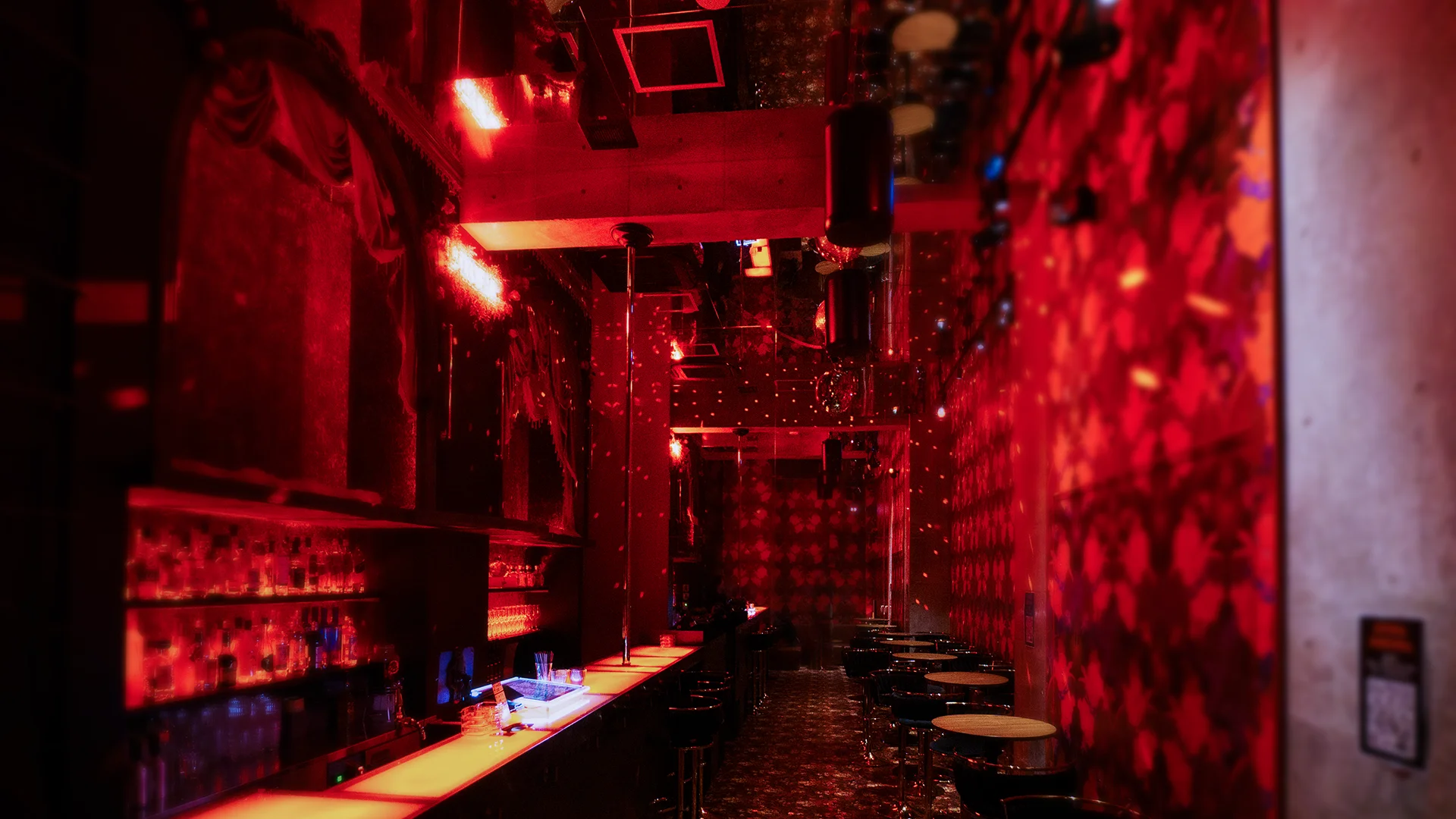 UTOPIAは、非日常な雰囲気に浸れる社交の場であり、フォトジェニックな空間を目指して作られました。バーカウンターにはポールダンス用のポールが備え付けられ、奥にはバーレスクパフォーマンスのためのステージも用意されています。