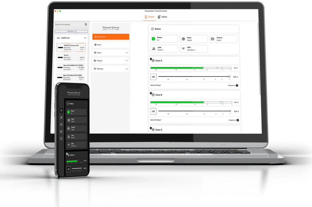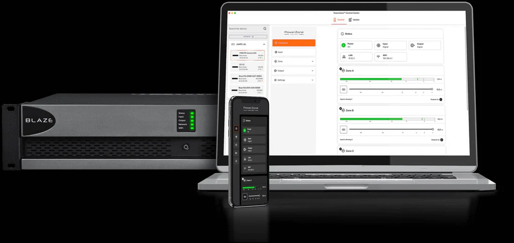 PowerZone™ Controlは、2つの柔軟なアクセスオプションにより、あらゆる導入環境に対応します。MacおよびWindows用のデスクトップアプリでは、接続されたすべてのBlaze Audioデバイスに対する一元的な設定、監視、ファームウェア管理が可能であり、一方、Webインターフェースでは、あらゆるブラウザやデバイスから直接リアルタイムで制御できるため、局所的な調整に最適です。