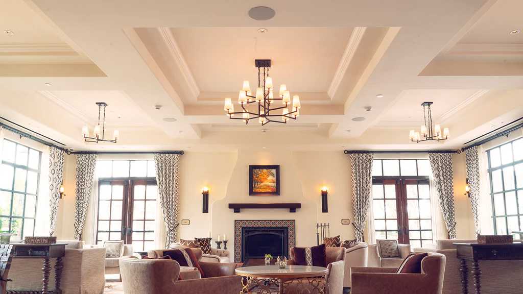 Sonance Invisibleシリーズのスピーカーは、建築デザインを損なうことなく、没入感のあるロビー空間を創り出します。